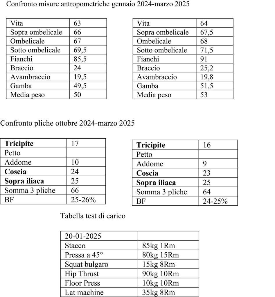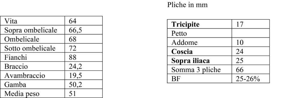 Le circonferenze sono aumentate, soprattutto fianchi, gambe e braccia, aumentato anche il peso, mentre le pliche sono rimaste pressoché invariate, anzi denotano una lieve discesa della percentuale di massa grassa corporea.